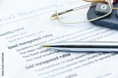Blue ballpoint pen, eye glasses and a calculator on a paper of financial analysis check lists. Financial and investment analysis concept.