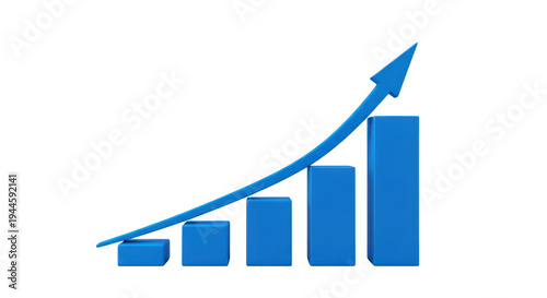 Blue bar graph with upward trend arrow on transparent background