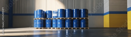 Blue Barrels Stacked on Pallets in Warehouse, Industrial Storage, Chemical Storage