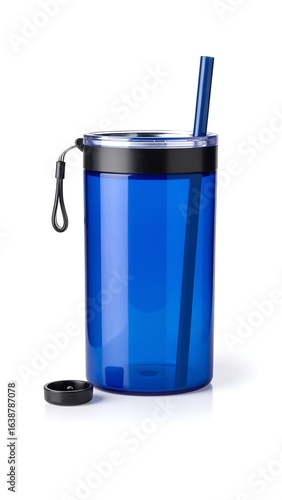 Blue cylindrical drinking bottle with straw