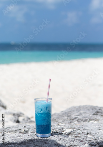 Blue drink on the beach. Glass with straw. Fresh and cold cocktail with turquoise sea in the background.