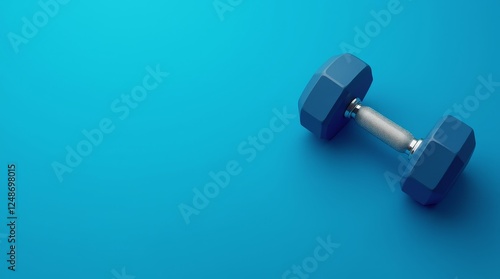 Blue dumbbell with metal handle placed on blue background, fitness equipment concept for gym, strength training, and exercise design with copy space