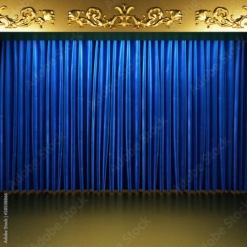 blue fabric curtain with gold on stage
