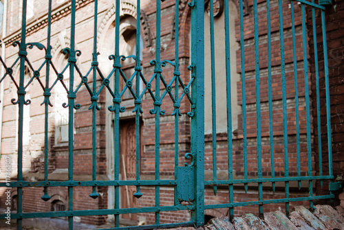 Blue fence and red brick building on a background