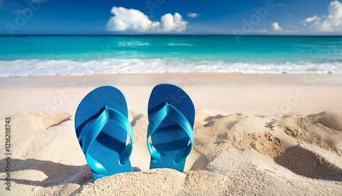 Blue flip flops on beach. Generated image