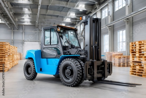 Blue forklift truck inside large warehouse building