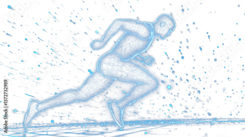 Blue glowing wireframe hologram of an athlete running on dark blue background concept for sport technology and futuristic digital design element