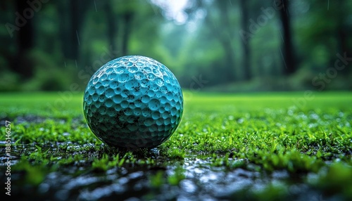 Blue golf ball on wet grass during rainy weather conditions. Ideal for sports marketing, course promotion, or recreation-themed visuals.