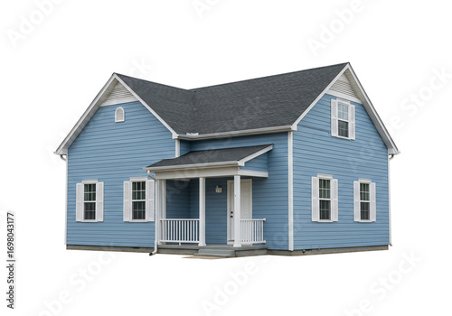Blue house exterior with porch and white shutters