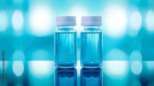 Blue Medicine Bottles with White Caps on Reflective Surface