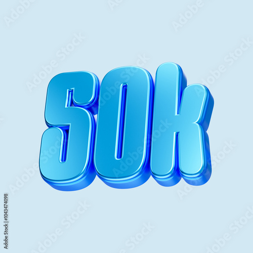 Blue metallic number. 50K Bright blue 3D Render. Isolated on white background.