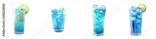 Blue Mocktail Drink with Ice Cubes and Lime Slice — Realistic Refreshing Summer Beverage Illustration — Isolated Transparent PNG Set