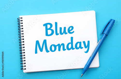 Blue Monday notebook with blue pen. A spiral notebook with Blue Monday written in bold blue text on a white page, accompanied by a matching blue pen, placed on a bright blue background, symbolizing a