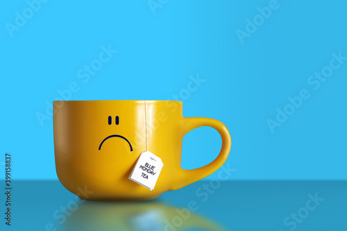 Blue monday tea text with sad smiley face on big yellow cup on blue background. The most depressing day of the year. Blue monday breakfast concept. Copy space.