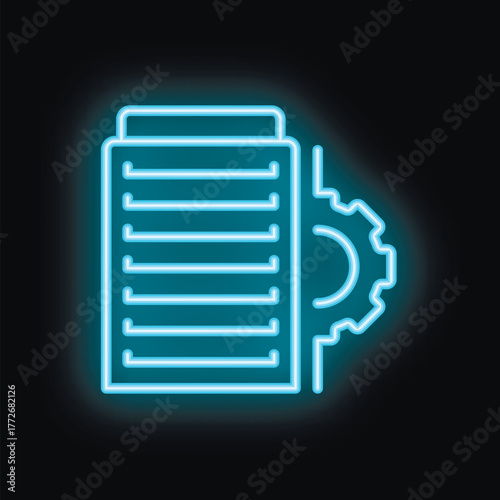 Blue neon server rack icon glowing against a black background representing data storage and processing