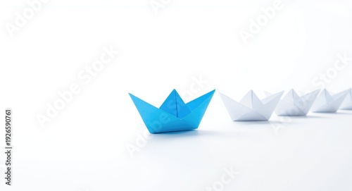 Blue origami boat leading white paper ships on a bright background symbolizing leadership