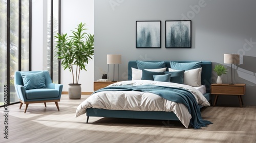 Blue pillows on white bed in bedroom interior with armchair