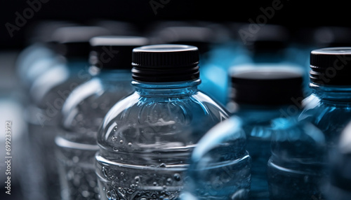 Blue plastic bottle with transparent liquid, reflecting purity and freshness generated by AI