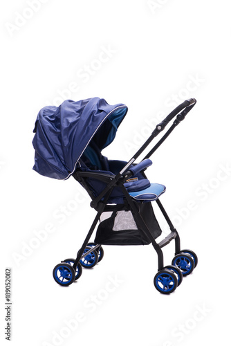 Blue pushchair isolated on white background