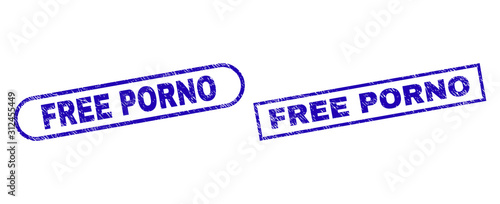 Blue rectangle and rounded FREE PORNO watermark. Flat vector distress watermarks with FREE PORNO title inside rectangle frame and rounded rectangle frames. Rubber imitation with distress texture,