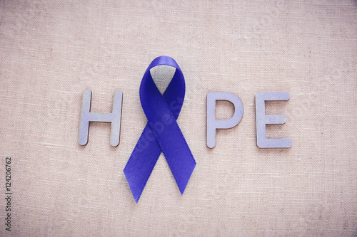 Blue ribbon with HOPE word, Child Abuse, Colon Cancer and Color