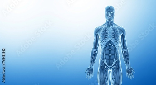Blue semi-transparent x-ray style render of human anatomy showing muscles and bones with detailed medical realism, ideal for educational healthcare content.
