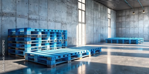 Blue shipping pallets arranged in a modern warehouse setting