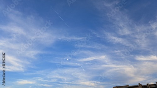 Blue sky and white streaks of clouds. Background. Texture. Copy space