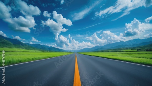 Blue sky over a mountain landscape along the asphalt road, panoramic view.