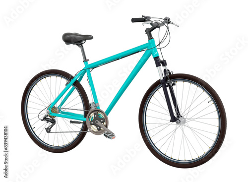 Blue teal bicycle, side front view. Black leather saddle and handles. Png clipart isolated on transparent background