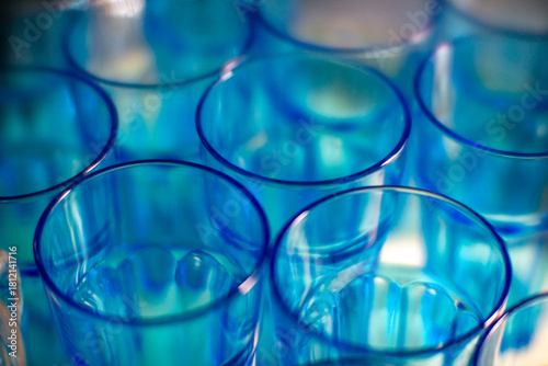 Blue transparent glasses stacked together creating an abstract pattern