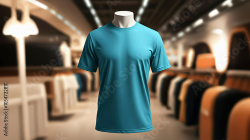 Blue t-shirt on mannequin for mock up, blurred store background