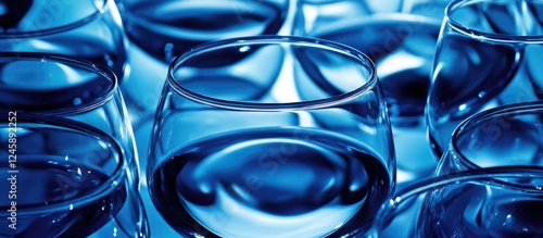 Blue wine glasses arranged artistically creating an abstract textured background showcasing varying shades of blue and light reflections.