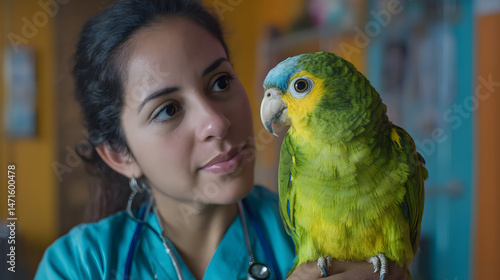 Blue-Fronted Amazon Parrot at Exotic Pet Clinic, Female Veterinarian Holding Colorful Tropical Bird During Health Checkup, Animal Care, Veterinary Medicine, Parrot Doctor, Ornithology, Pet Wellness, B