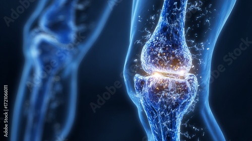 Blue-isolated knee joint. Illustrates concepts like bone health, physiotherapy, joint disorders, glucosamine & magnesium supplements, orthopedic surgery, and osteoarthritis treatment.