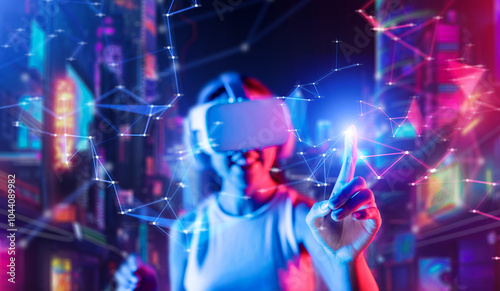 Blur of smart female stand in cyberpunk style building in wear VR headset connecting metaverse, future cyberspace community technology, Woman use index finger touch virtual object. Hallucination.