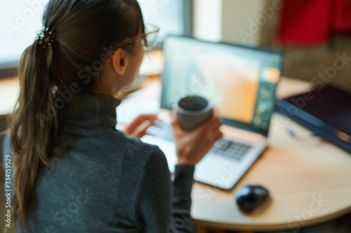 Blured image woman freelancer sitting at desk, enjoying coffee, using laptop computer. Skilled graphic designer working on new project. Concept remote work, freelance, using laptop computer. Back view