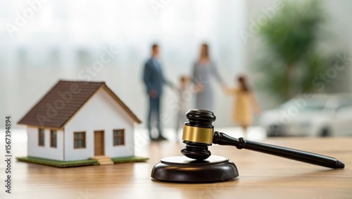 Blurred background with judge’s gavel beside miniature home, car, and family figures symbolizing legal protection