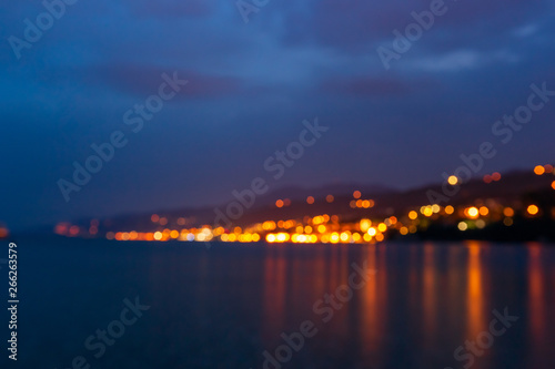 Blurred cityscape with light bokeh and sea