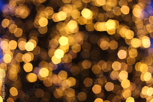 Blurred defocused picture of Christmas tree golden lights, festive background for design
