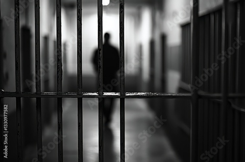 Blurred Figure Walking Through Prison Corridor in Black and White