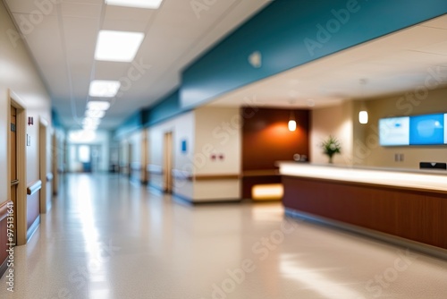 Blurred Hospital Corridor with Defocused Reception and Light Reflections