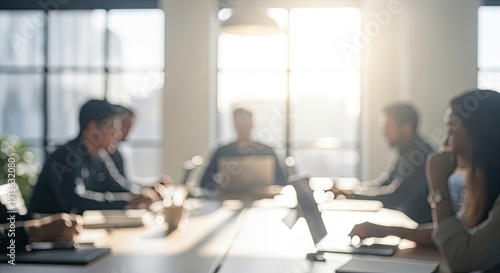 Blurred image of diverse business professionals collaborating in a modern office meeting room.