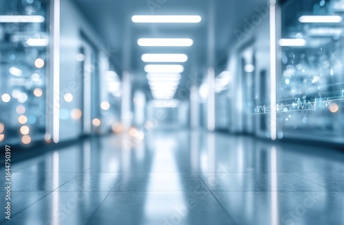 Blurred interior hallway, modern and spacious. Light blue tones, reflecting surfaces. Glimmering lights. Abstract digital overlay