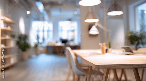 Blurred Interior of an Office with Soft Lighting and Wooden Elements