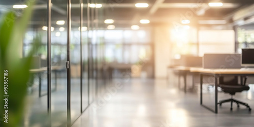 Blurred modern office interior with natural light and desks ideal for professional mockups