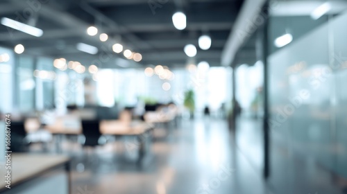 Blurred office interior with desks chairs and lights creates a modern workspace.