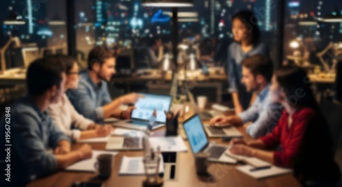 Blurred office meeting background with coworkers discussing in a modern workspace setting