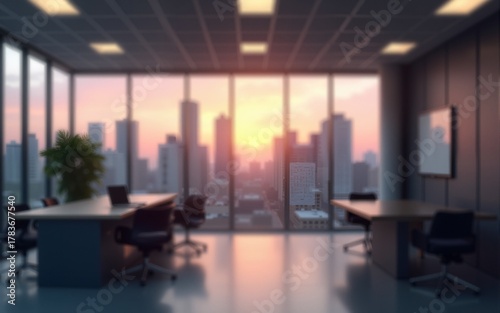Blurred office workspace in the evening , interior workplace with cityscape for business presentation background, AI generated. High quality