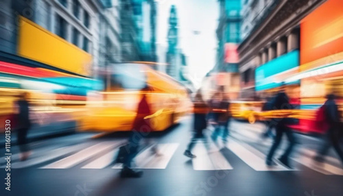 Blurred people in motion on bright street.